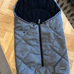 Åkpåse i gråmelerat mönster med svart foder. Dragkedja längs sidorna och knappar för att justera öppningen runt huvudet (ser finare ut än på bilden??)