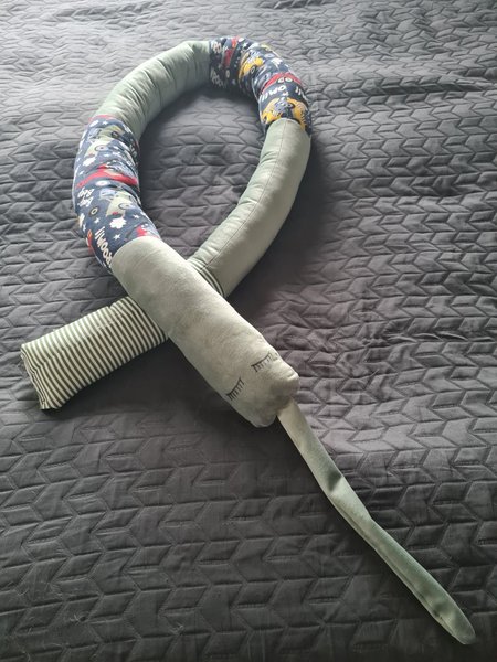 Handgjord sovorm, storleken är perfekt till vagga, barnvagn eller gosedjur. Längd ca 1,85m. Alla tyger är i polyester, de är nya och tvättade. Stoppning: polyerster.