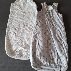 Två mysiga sovpåsar, en i gul färg med broderad detalj och en i beige med mönster.