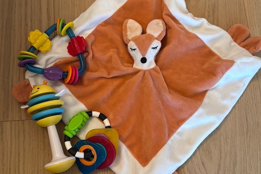 En mjuk snuttefilt från kids concept som knappt är använd. Med filten följer tre olika skallror i varierande färger och former.