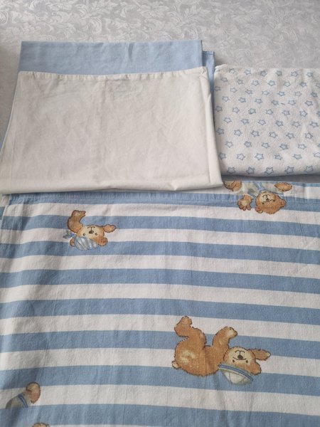 Fint set med lakan och örngott. Ett lakan är randigt med nallar, ett annat är vitt med en blå kant och ett örngott är vitt med blå stjärnor.