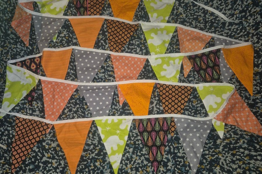Hemsydda vimplar för dekoration i barnrum eller vid kalas. Bomullstyger bla från panduro. Nyskick.