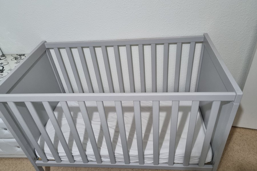 Spjälsäng i grått