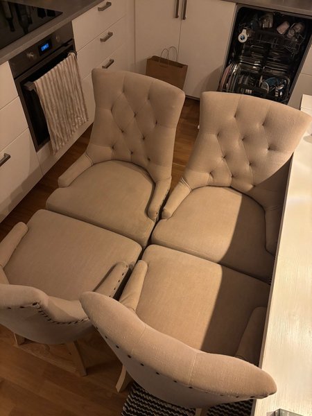 Matstolar i tyg med armstöd. Stolarna har en knappad rygg och synliga nitar längs sidorna. Benen är i trä.