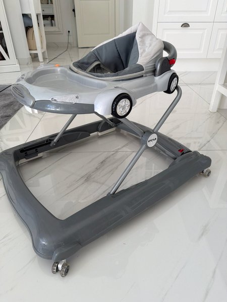 Gåstol i grå färg. Designad som en bil med ratt och hjul. Sittdelen är vadderad i grått och vitt tyg. Stommen är i grå plast och metall. Går att justera höjd. Felfri.