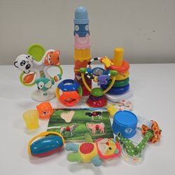 Ett blandat paket med leksaker för bebis. Innehåller bland annat skallror, bitringar, aktivitetsleksaker och en dragleksak.