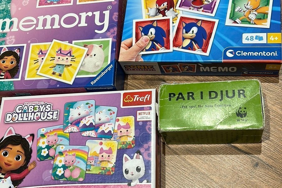 Ett set med olika memo spel. Inkluderar Gabby's Dollhouse, Sonic the Hedgehog och andra.