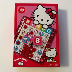Hello Kitty Bingo från Alga. Spelet innehåller 6 spelplaner, 2 tärningar och plastmarkörer. För 2-6 spelare, från 4 år.