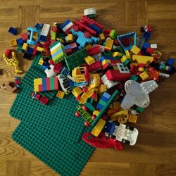 Ett stort parti LEGO Duplo, inklusive basplattor, tåg och diverse klossar och figurer. Perfekt för små barn att utforska sin kreativitet med.