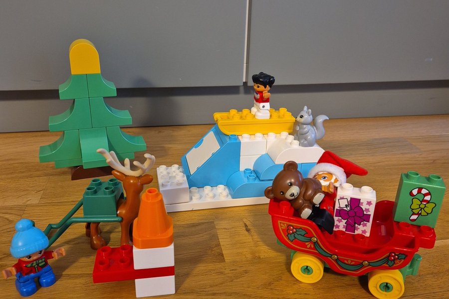 Lego Duplo julset med jultema. Inkluderar figurer som jultomten, barn, ren, ekorre och ett julgran. Släden är fullastad med julklappar och en nallebjörn.