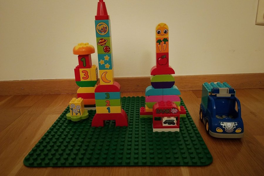 Lego Duplo set med olika klossar, en bil och en grön byggplatta. Perfekt för små barn att utveckla sin kreativitet och motorik.