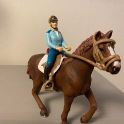 Leksaksset från Schleich med häst och ryttare. Perfekt för barn som älskar hästar och rollspel. Borsten går att ta av från handen. Lite bleka fläckar på hästen se bilder annars fint skick.
