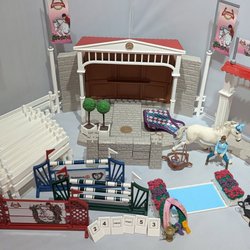 Leksakshästgård med staket, hästar, ryttare och tillbehör. Perfekt för barn som älskar hästar och rollspel.