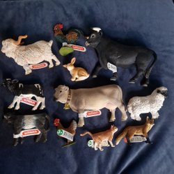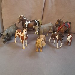 Ett set med Schleich djurfigurer. Inkluderar hästar, åsna, struts, ko, rådjur, pingvin med unge, katt, hund och kanin.