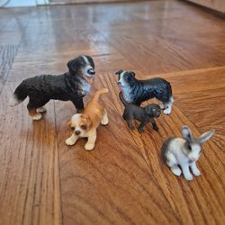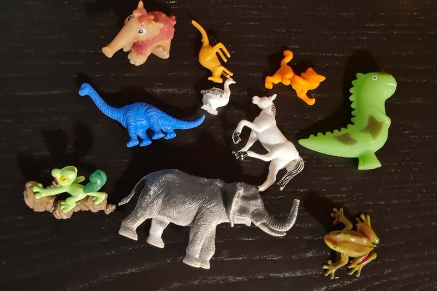 Ett set med olika leksaksdjur. Inkluderar en elefant, häst, dinosaurier, grodor och andra djur.