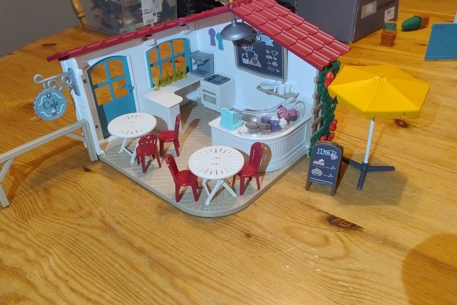 Leksakscafé med tillbehör. Perfekt för barnens fantasifulla lekar. Inkluderar cafébyggnad, möbler och diverse tillbehör som syns på bilden.