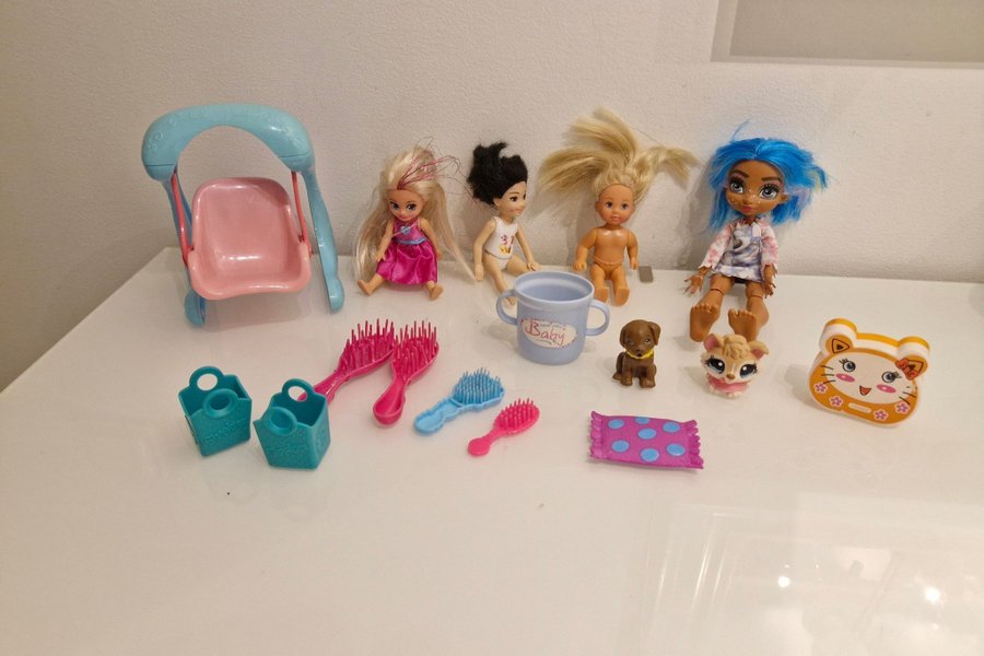 Leksakspaket med dockor, gunga, borstar, mugg, shoppingkorgar, hund, katt och kudde.