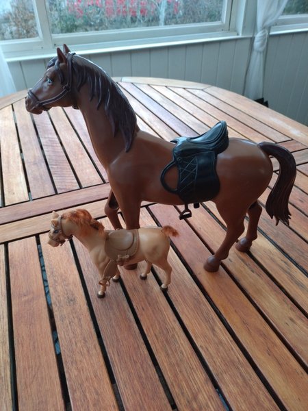 Två leksakshästar i plast. En större brun häst med sadel och en mindre ljus häst med sadel.