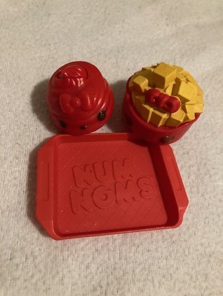 Num Noms figurer i form av en påse Pommes Frites och Ketchup med en röd bricka. Perfekt för lek eller samling! Är endast förvarade.