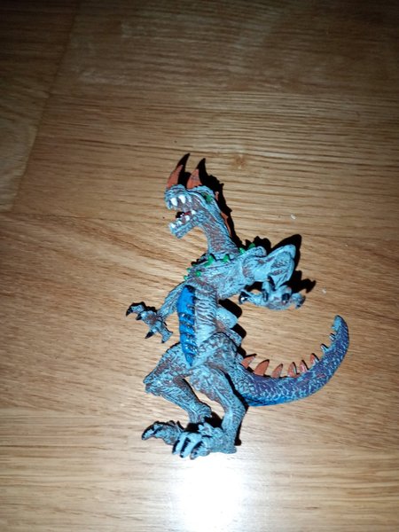 En leksaksdrake i plast. Den har två huvuden, taggar längs ryggen och svansen, samt horn på huvudet.