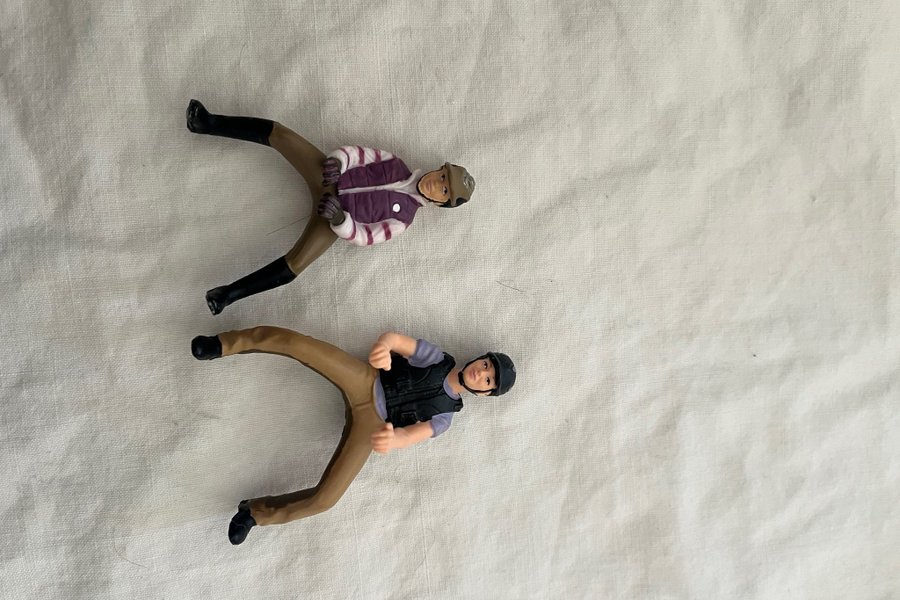 Två Schleich ryttarfigurer. En figur har en lila och vit randig jacka, bruna ridbyxor och svarta stövlar. Den andra figuren har en grå tröja, svart väst, bruna ridbyxor och svarta stövlar. Båda figurerna har hjälm.