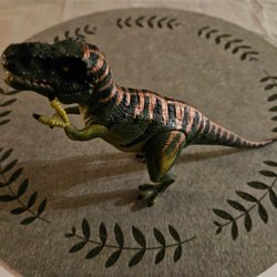Leksaksfigur i form av ett monster eller en robot. Den har en mörkgrön färg med orange detaljer på huvudet och silverfärgade horn.