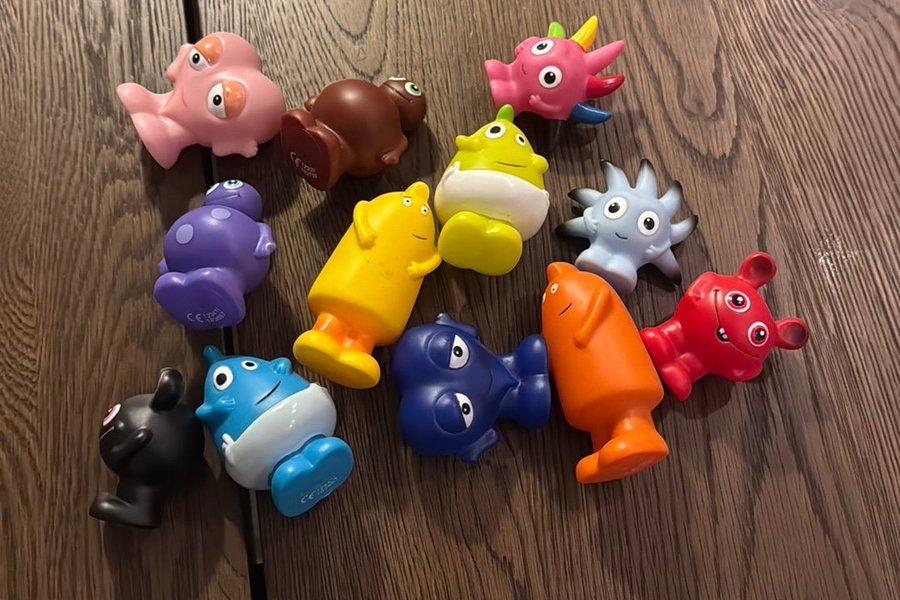 Set med 12 badleksaker i olika färger och former. Leksakerna är tillverkade av gummi.