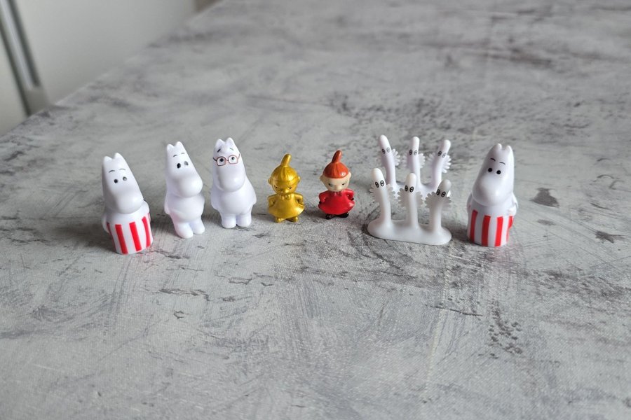 Set med åtta Mumintroll figurer.