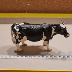Schleich ko i brunt och vitt. Leksaken är en detaljerad modell av en ko. I rätt bra skick förekommer lite nötningar i färgen vilket man ser på bild nr 1 och 2. Tycker kossan är rätt fin.