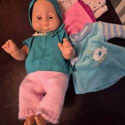 En söt docka med flera olika klädesplagg. Inkluderar kläder som tröja, byxor och mössa, samt sommarkläder som shorts och t-shirt. ca 43 cm, har nåt litet streck på magen finns.