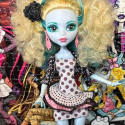 Den läckra rosa/ljusblå volang klänningen med bat print kommer från Draculaura Party Hair -2016 dockan och dom superfina vita bootisen med rosa snirklig klack är från Draculaura Art Class -2013