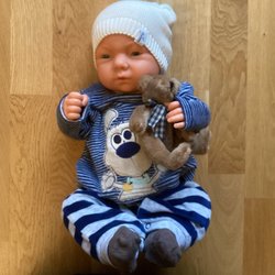 En docka med svart hår och en rosa klänning med svarta detaljer. Dockan har rosa skor. Längd: 52 cm.