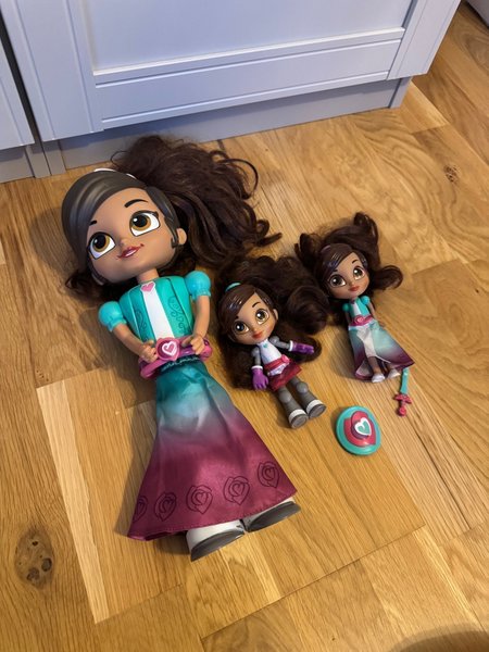Tre Nella the Princess Knight dockor. En stor docka och två mindre dockor. Inkluderar en sköld.