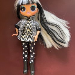 LOL docka med rosa hår och klänning med jordgubbsmönster. Klänningen har en guldfärgad kant.