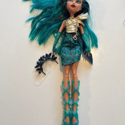 Docka med stickad sparkdräkt och mössa till docka. Kläderna är i blåa och turkosa nyanser.
