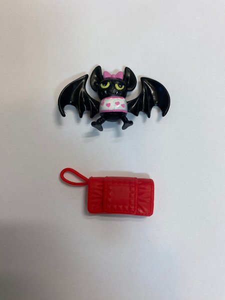 Ett set med en Monster High figur (fladdermus) och en röd väska.