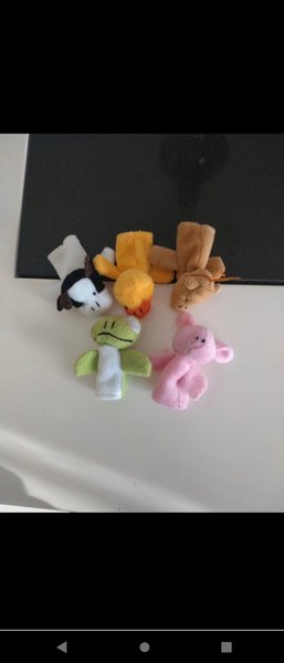 Ett set med fem stycken fingerdockor Inkluderar en ko, anka, häst, groda och en gris.
