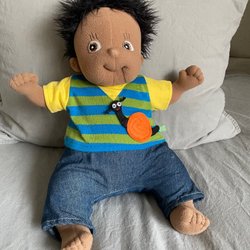 En söt mjukdocka med svart hår och en färgglad klänning. Kan finnas tecken på lek men mesta dels stått på hyllan