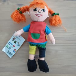 En Pippi Långstrump docka med orange hår och typiska kläder. Dockans höjd är cirka 22 cm. I fint skick med håret har nopprar, se bild. Dockan är nytvättad.