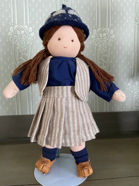 En handgjord docka med brun hår, klädd i en blå blus, en randig kjol och väst. Dockan har en stickad mössa och små skor.