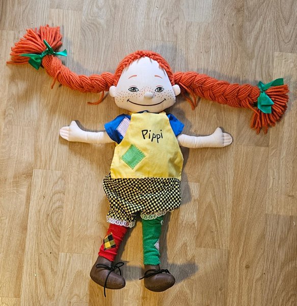 En tygdocka föreställande Pippi Långstrump. Dockan har rött garnhår flätat i två tofsar med gröna band. Hon bär en gul förklädesklänning med texten "Pippi" och en grön lapp. Under förklädet syns en blå tröja och svart- och vitrutiga shorts. Fötterna har en röd och en grön strumpa samt bruna skor.