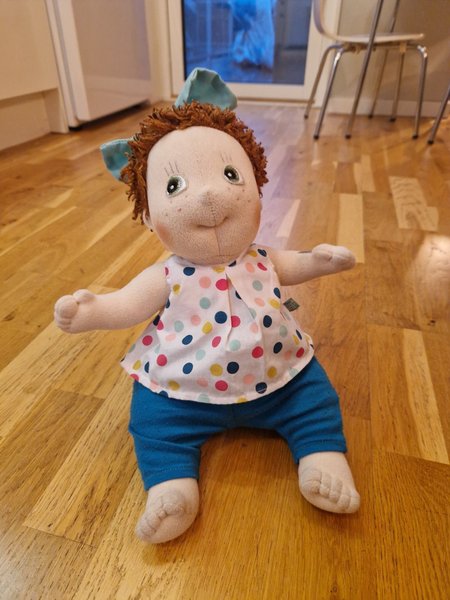 En söt mjukdocka med rött hår och en klänning med prickar. Dockan har blå byxor och en matchande rosett i håret.