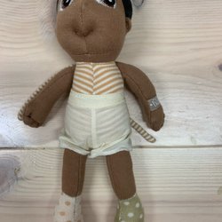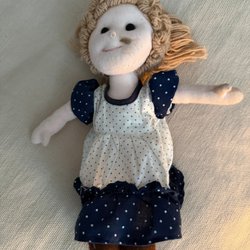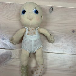 Docka med två ansikten med olika uttryck. En sida sovande och andra sidan vaken. 60 cm lång. Ej Ce-märkt. Ej lekt med endast använd som prydnad.