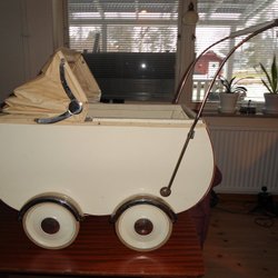 En charmig retro dockvagn med röd klädsel och kromad ram. Perfekt för samlare eller som en dekorativ detalj i barnrummet. Inkluderar en liten leksaksmobil. Kan avhämtas i Simrishamn eller Lomma.