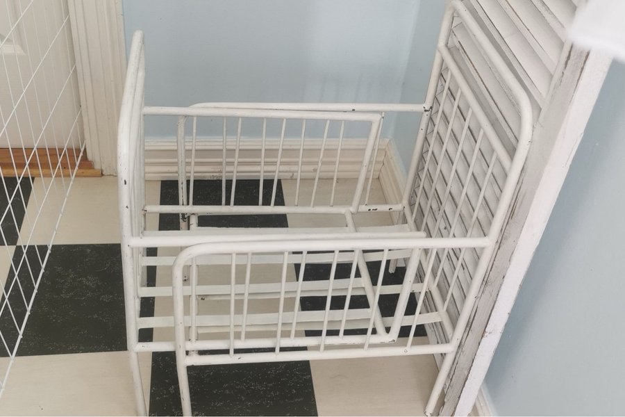 En vit spjälsäng i metall. Perfekt för barnrummet. Längd ihopdragen 60*35 höjd 60