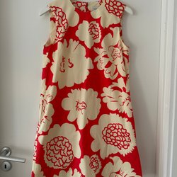 Ett litet bord med en vit hexagonformad bordsskiva och ett rött kryssformat underrede. Perfekt för dockskåpet eller som en dekorativ detalj.