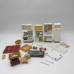 Ett paket dockskåpsmöbler i behov av reparation/renovering. Alla är trasiga och behöver repareras. Vissa delar på möblerna saknas.