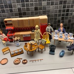 Ett set med dockskåpsmöbler och tillbehör. Inkluderar möbler för vardagsrum, sovrum och andra rum. Även dockor, och gardiner ingår.Se noga på bilder förskick.