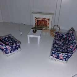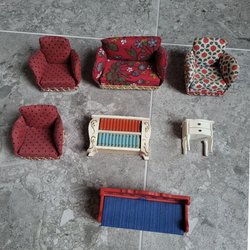 En uppsättning av möbler för ett dockhus. Inkluderar våningssäng, mjuk soffa med fåtölj, köksbord med fyra stolar med vadderad dyna, ovalt soffbord, ett pelarbord, 2 mattor, bordsur, vagga och barnstol, leksaksback och två golvlampor, allt för att skapa ett mysigt hem i miniatyr. Obs två av köksstolarna är lagade.