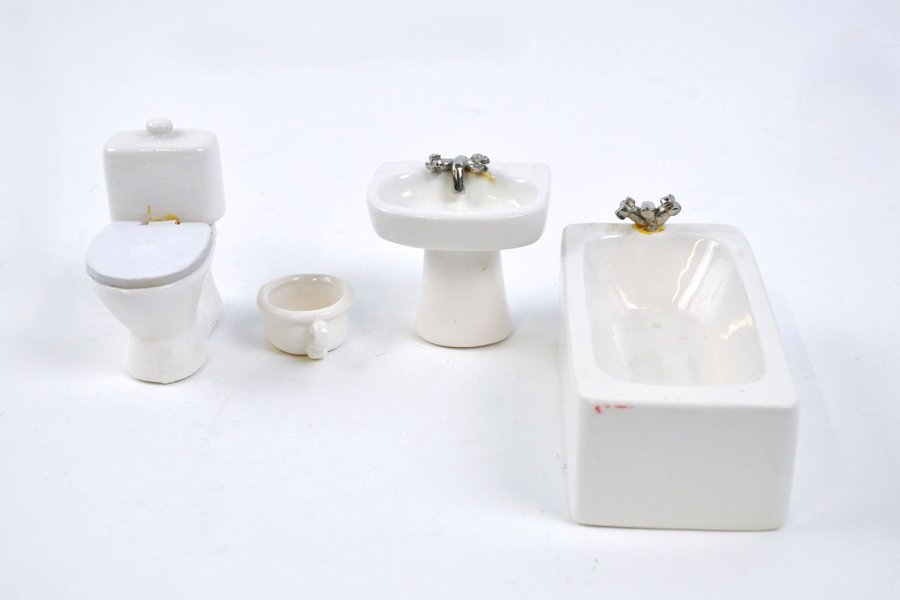 Ett set med badrumsinredning till ett dockskåp, tillverkade i porslin.
